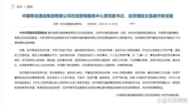 中央纪委国家监委网站讯据中国移动通信集团有限公司纪检监察组、北京市纪委监委消息:日前,经中央纪委国家监委批准,中国移动通信集团有限公司纪检监察组、北京市昌平区监察委员会对中国移动通信集团有限公司在线营销服务中心原党委书记、总经理陆文昌严重违纪违法问题进行了纪律审查和监察调查。
