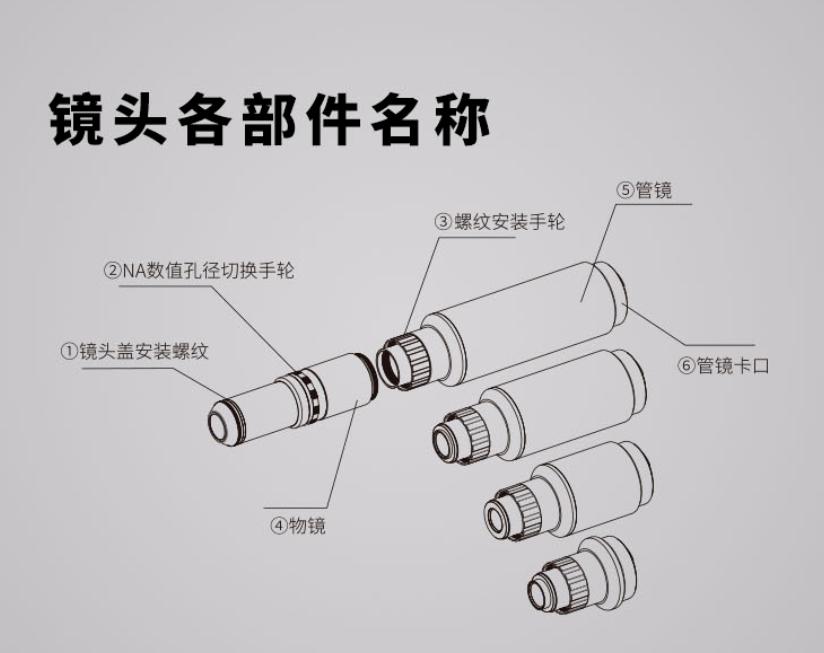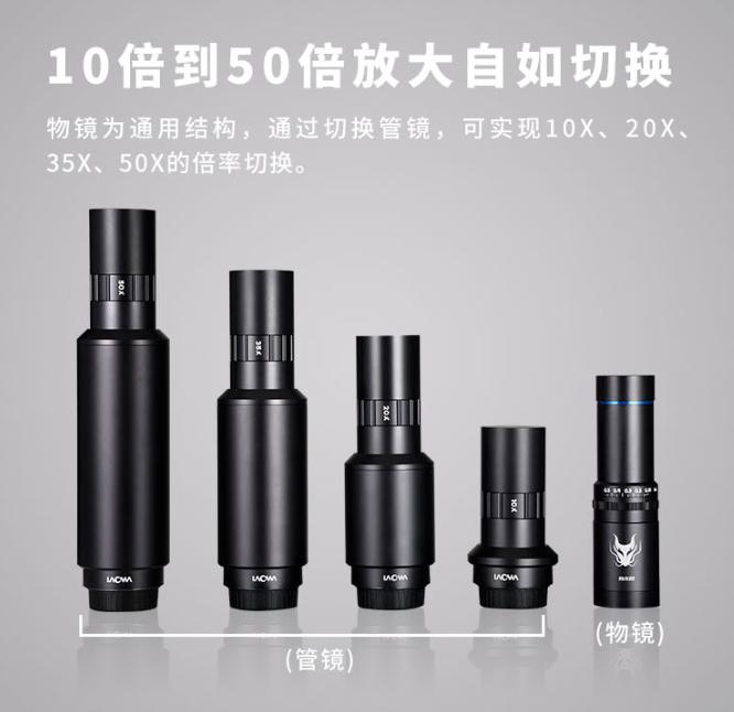 该镜头采用分体式设计,物镜为通用结构,通过切换管镜,来实现 10 倍、20 倍、35 倍、50 倍的放大倍率切换。