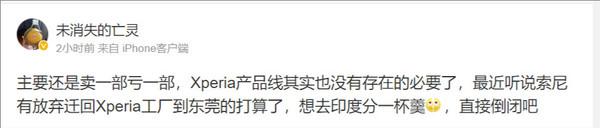 根据网友的说法,索尼现在的手机业务是 " 卖一部亏一部,Xperia 产品线其实也没有存在的必要了 "。其还透露,索尼最近放弃了将 Xperia 工厂迁回东莞(中国)的计划,似乎正在考虑将其迁往印度。网友还表示,索尼这样做正是因为想去印度 " 分一杯羹 ",也就是获得印度的市场份额。
